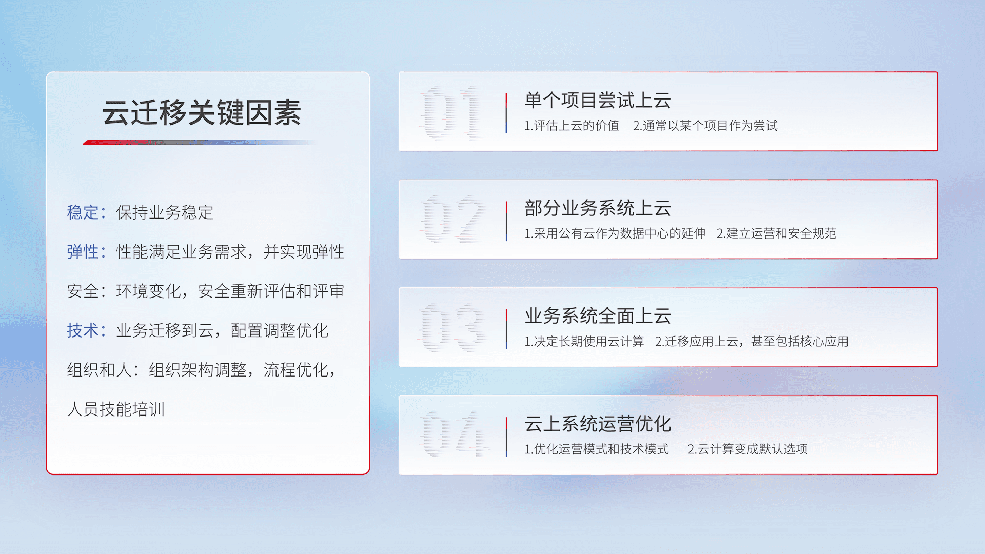 结合实际业务,,,从规划设计、、、、云平台选型、、云原生改造、、数据迁移、、、、集成交付,,,迁移全过程为客户识别最佳上云路径,,做好风险识别管理,,,,设计网络架构、、、、身份权限、、、、安全审计合规、、、操作审计、、、、日志审计、、监控告警策略、、、、多站点容灾设计等,,,,对云上基础设施进行整体规划,,提升IT治理水平,,以满足弹性、、、、高可用、、、、高性能的需求。。
