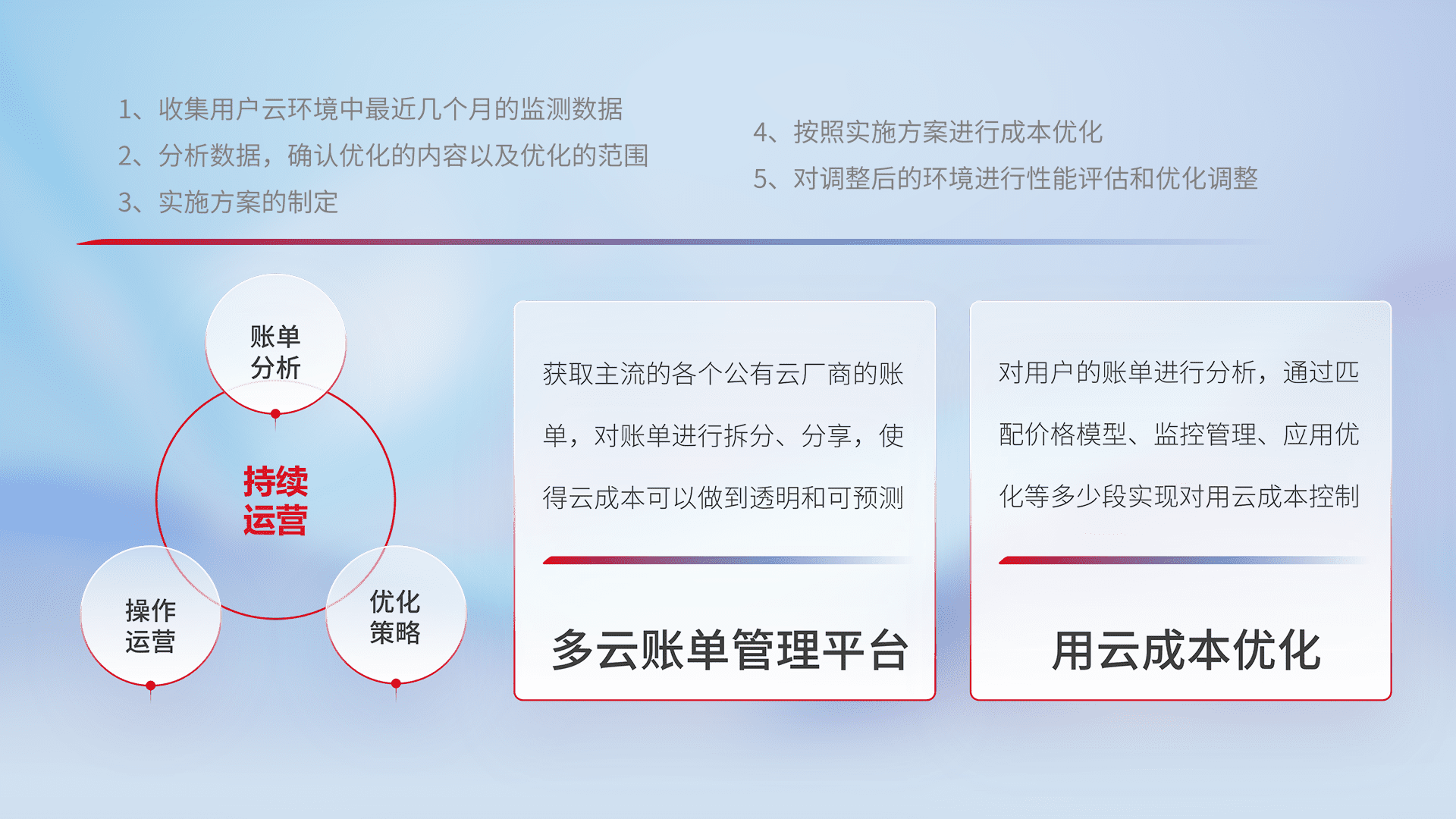 通过多云纳管,,以统一的资源数据模型把客户的云资源进行抽象和封装,,,进而实现对多云资源的统一操作,,,,保障云资源管理的可靠性、、、稳定性与可用性。。。。量身定制化运维内容,,,,配置、、、开发运维、、、补丁管理、、备份、、、、监控、、、、认证和访问管理、、、、审计和日常巡检等,,保障在用云过程中的可靠度,,,,稳定度以及高可用率。。。